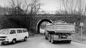 Eng war es, das Nadelöhr zur Okrifteler Straße. Ein Bild aus dem Jahr 1984 zeigt anschaulich die Problematik, wenn zwei Fahrzeuge an dieser engen Stelle aufeinandertrafen. Zudem war es für die Brummifahrer durch den Rundbogen teilweise besonders knifflig. Erst im Jahr 1996 wurde die Durchfahrt verbreitert, so dass problemlos nun die Fahrzeuge nebeneinander hindurchfahren konnten. Zu Stoßzeiten, wenn Schichtwechsel bei der ehemaligen Ticona und dem Frankfurter Flughafen waren, brauchte man besonders viel Geduld, bis man endlich auf die B43 abbiegen konnte. (Text: cs)
