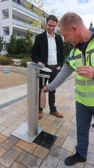 Stefan Ehser (im Vordergrund) und Maximilian Barth testen den Geschmack des Wassers aus dem ersten Trinkwasserbrunnen am Baugéplatz. Ergebnis: einwandfrei.