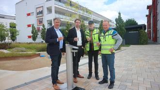 v.l.: Bürgermeister Manfred Ockel, Klimaschutzbeauftragter Maximilian Barth und vom städtischen Tiefbau Maik Schubert und Stefan Ehser sind begeistert vom ersten Trinkwasserbrunnen.