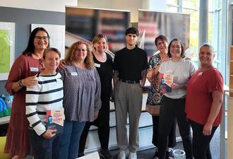 Freuten sich über eine gelungene Auftaktveranstaltung: (vl.) Martina Pulkis (Schulkindbetreuung BHS), Petra Schindler (Offenes Angebot KTS), Sabina Dahmane (Kitaleitung), Daniela Cibis (Schulsozialarbeit KTS), Autor Norman Wolf, Gabriele Stutz (Schulsozialarbeit IGS), Katrin Hoffmann (Schulsozialarbeit BHS), Anna Brückner (Kommunale Sozialarbeit).