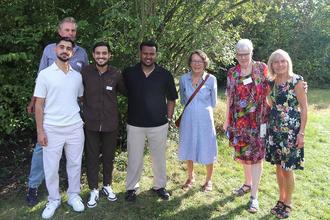 Klassentreffen der besonderen Art (vorne, von links): Hussein Mohamed aus Syrien, Zacharias al-Obaidi aus Iran und Alex Daniel Mezgebe aus Eritrea mit Push-Coach Matthias Künstler (hinten links), Agneta Becker (2. von rechts) und den ehemaligen Lehrerinnen Doris Gottschalk (rechts) und Isabella Brauns (3. von rechts).
