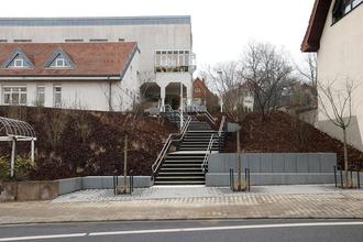 Unten, an der Bergstraße, wurde die Zugangssituation zur Treppenanlage deutlich umgestaltet. So wurde eine Teilfläche neu gepflastert, zwei großzügige Sitzmauern bieten Möglichkeit zum Aufenthalt und drei Zierkirschenbäume bieten Schatten. Es ist vorgesehen, dass in Kürze der Name „Fritz-Treutel-Haus“ auf der Rückenlehne der Sitzmauern auf einer Länge von 2,50 Metern gut lesbar angebracht wird.