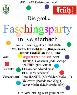 Die Vorbereitungen laufen! Der BSC 1947 Kelsterbach lädt am Samstag den 10.02.2024 zur Faschingsparty im Bürgerhaus Kelsterbach ein. Einlass ist ab 19:11 Uhr. Eintrittskarten gibt es im Vorverkauf (10€) bei Foto Handl, Deniz Markt und in der Gaststätte Dickworz. Um Verkleidung wird gebeten! Mit dreifachem "Helau" freut sich der BSC auf Ihren Besuch.