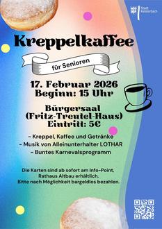 Am Dienstag, 17. Februar, von 15 Uhr bis 18 Uhr, heißt es wieder: gemütlich zusammensitzen, lachen und genießen. Die Stadt Kelsterbach lädt alle Seniorinnen und Senioren herzlich zum Kreppelkaffee in den Bürgersaal des Fritz-Treutel-Hauses, Bergstr. 20, ein.