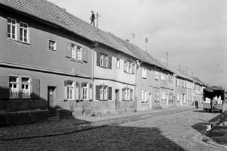Das Bild zeigt einen Schornsteinfeger bei der Arbeit in der Neukelsterbacher Straße; es wurde im Jahr 1949 von Richard Siebart aufgenommen, seines Zeichens Werksfotograf der ehemaligen Glanzstofffabrik in Kelsterbach.