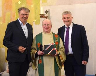 Bürgermeister Manfred Ockel (l) und sein Amtskollege Marcus Merkel aus Büttelborn (r) gehörten zu den Überbringern zahlreicher Grußworte an Pfarrer Franz-Josef Berbner (m).
