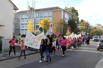 „Wir sind Mädchen, wir sind stark – starke Mädchen, Kelsterbach!“ skandierten fortwährend und lautstark die Teilnehmerinnen der Demonstration, denen sich Stadtverordnetenvorsteher Frank Wiegand als nahezu einziger männlicher Teilnehmer solidarisch angeschlossen hatte. Auf mehreren großen, selbstgestalteten Bannern hatten die Mädchen ihre Slogans, die das eigene Selbstbewusstsein als junge Frauen ausdrückten, und ihre Forderungen nach Gleichberechtigung aufgemalt. Vom Rathausplatz ging es, eskortiert von zwei Polizeifahrzeugen, über die Mörfelder Straße zur Stadt- und Schulbibliothek, von da zum Haus Weingarten, dann weiter über den Sandhügelplatz in Richtung Bahnhof und durch die Fußgängerunterführung zurück zum Rathausplatz. Unterwegs lockte der Zug einige neugierige Anwohnerinnen und Anwohner vor die Türe, die erstaunten Blickes nachschauten, was da wohl gerade auf der Straße vor sich ging.