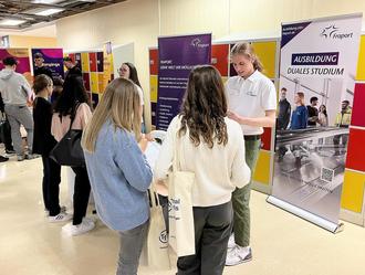 Die Ausbildung zur Pflegefachfrau und zum Pflegehelfer stellte ein Team vom Haus Weingarten vor. „Für uns ist die Möglichkeit, auf dieser Messe mit jungen Menschen in Kontakt zu treten, sehr wichtig“, so David Koslik. „Es gibt einen Pflegenotstand und junge Menschen auszubilden ist uns eine Herzensangelegenheit.“ Von den interessierten Schülern wurden sie besonders häufig gefragt, was man in dem Beruf verdient, berichtet Koslik weiter. Aber auch die Frage nach den verschiedenen Aufgabefeldern in einer Einrichtung wie dem Haus Weingarten bekamen sie oft zu hören. „Uns ist es wichtig, den Jugendlichen zu vermitteln, dass man bei uns viel lernen und dabei auch eine gute Zeit haben kann.“