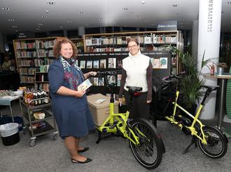 (vl.) Bibliotheksleiterin Meike Betzold und Nahmobilitätsbeauftragte Lilly Hermann bewundern die ausgestellten Lastenfahrräder.