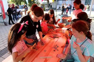 Am Stand der Musikschule wurden Rasseln und Tröten für den Demonstrationszug gebastelt.