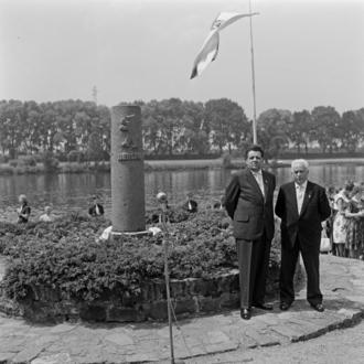 Im Juni des Jahres 1962 wurden an vielen Orten im Kreis Groß-Gerau kleine Säulen aus Tuffstein aufgestellt, die so genannten Berlin-Säulen. Sie sollten an den Volksaufstand am 17. Juni 1953 in der DDR und an den Bau der Berliner Mauer 1961 erinnern. In Kelsterbach stellte man die Säule in den Mainanlagen auf. Sie erbte den Platz, auf dem einige Jahre zuvor der „Trommelnde Pimpf“ aus der Zeit des Nationalsozialismus stand. Auf dem Bild steht der damalige Bürgermeister Kelsterbachs, Fritz Treutel (links), neben dem Landrat des Kreises Groß-Gerau, Wilhelm Seipp. Schaut man sich heute die Säule an, so stellt man fest, dass die Witterung ihre Spuren an dem Denkmal hinterlassen hat und das Wappen nebst Schriftzug kaum noch zu erkennen ist. (Text/Bilder: Schönstein/Stadtarchiv)