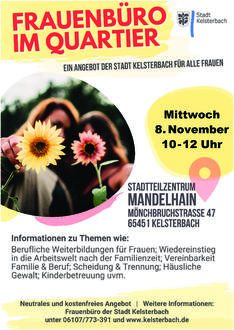 Die Frauen- und Gleichstellungsbeauftragte der Stadt Kelsterbach, Manuela Draisbach, bietet am Mittwoch, 8. November, von 10 Uhr bis 12 Uhr, Informationen für Kelsterbacher Bürgerinnen im Stadtteilzentrum Mandelhain, Mönchbruchstraße 47, an.
