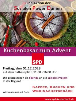 Unter dem Motto „Es gibt nichts Gutes, außer man tut es“ ist es zu ihrer Tradition geworden, auf dem Kelsterbacher Markt vor dem 1. Advent einen Kuchenbasar zu veranstalten. Nach genau zwei Jahren sind die Sozialen Power Damen des SPD-Ortsvereins Kelsterbach wieder auf dem Markt.