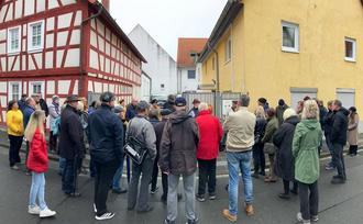 Beginnend am alten Marktplatz vor der Martinskirche führte der Rundgang über die Untergasse zur Neukelsterbacher Straße und schließlich zum Friedhof. Harald Freiling ließ die rund 60 Interessierten anschaulich an seinen Rechercheergebnissen teilhaben, die er als Geschichtslehrer der IGS Kelsterbach gemeinsam mit seinen Schülerinnen und Schülern erarbeitet hatte. Die Stolpersteine auf dem Weg, von denen es in Kelsterbach 52 gibt, erzählen die Geschichte des jüdischen Lebens in Kelsterbach, der Flucht, des Tötens und des Überlebens im Exil.