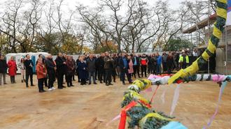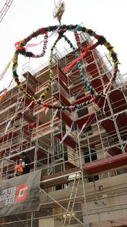 Der traditionelle Kranz zum Richtfest wurde nach dem Richtspruch in die Höhe gezogen.