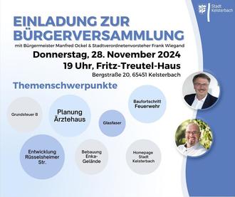Nach Beendigung der Abgabephase stehen nun die Themen für die Bürgerversammlung fest. Diese sind: Grundsteuer B, Planung Ärztehaus, Entwicklung Rüsselsheimer Straße, Bebauung Enka-Gelände, Baufortschritt Feuerwehrhaus, Stand Glasfaserverlegung sowie Vorstellung der neuen städtischen Homepage. Stadtverordnetenvorsteher Frank Wiegand sowie Bürgermeister Manfred Ockel informieren die Anwesenden zu diesen Themen und treten mit den Besucherinnen und Besuchern in den Dialog. (sb)