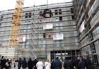 Höhepunkt des Richtfets war der Richtspruch, den Matthias Beier vom verantwortlichen Generalbauunternehmen Kassecker übernahm. Trotz winterlich anmutender Temperaturen feierten die anwesenden Gäste, zu denen auch Vertreter der städtischen Gremien und des Magistrats gehörten, die Zeremonie, bevor es dann zu einem Buffett in den Rohbau ging. Auch wenn mit der Fertigstellung der Erd- und Technikgeschosse sowie der ersten fünf Hotelzimmeretagen ein wichtiger Meilenstein erreicht worden ist, gehen die Arbeiten an dem Rohbau zügig weiter. Aktuell läuft der Fenstereinbau und in Kürze beginnen die Dachdeckerarbeiten, um das Gebäude winterdicht zu machen. Noch im Dezember ist geplant, mit dem Innenausbau zu beginnen. Wenn die Arbeiten beendet sind, wird das Hotel über 175 Zimmer verfügen und soll sowohl Messegäste, als auch Geschäfts- und Freizeitreisende ansprechen. Auch wenn bis dahin noch viel zu tun ist, blickte Wittkop am Ende des Richtfests schon mal erwartungsvoll in die Zukunft: „Ich freue mich, wenn wir uns alle hier in einem Jahr wiedersehen und dann nicht mehr im kahlen Rohbau, sondern in der fertigen Lobby stehen werden.“ (sb)