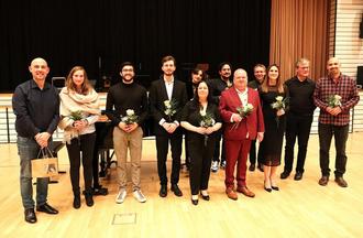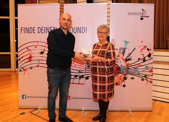 Musikschulleiter Marc Fischer (l.) bedankt sich bei den Dozentinnen und Dozenten für ihre Darbietungen.
