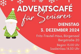 Die Stadtverwaltung lädt die Kelsterbacher Seniorinnen und Senioren zum Adventscafé ein, das am Dienstag, 3. Dezember, 15 Uhr, im Bürgersaal des Fritz-Treutel-Hauses stattfindet. Die festliche Zusammenkunft steht ganz im Zeichen der Vorweihnachtszeit, Alleinunterhalter Lothar sorgt für die passende musikalische Umrahmung. Für das leibliche Wohl ist gesorgt: Im Eintrittspreis von vier Euro sind zwei Stücke Kuchen, frisch gebrühter Kaffee und eine Auswahl weiterer Getränke enthalten.