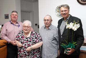 Bürgermeister Manfred Ockel (rechts) gratulierte Doris (2. von links) und Georg Schläfer (2. von rechts) zur Eisernen Hochzeit. Zum Gratulieren war auch Sohn Udo Schläfer (links) vorbei gekommen.