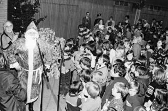 Streng blickt er drein, doch war er bestimmt nicht gemein. Ein Bild aus dem Jahr 1977 zeigt den Nikolaus in einer der Mehrzweckhallen bei einer Weihnachtsfeier. Um welche der damals noch zahlreichen Weihnachts- und Nikolausfeiern es sich hier handelt, ist leider nicht bekannt. Jedenfalls waren sehr viele Kinder vor Ort und schauten andächtig und voller Ehrfurcht zum St. Nikolaus auf, mit der Hoffnung, dass er ihnen die kleinen und größeren Unartigkeiten wohl verzeihen mögen. Da im Hintergrund jedoch Berge von Weihnachtstüten stehen, kann die Kindermeute wohl nicht allzu schlimm in jenem Jahr gewesen sein. Somit hat bestimmt jedes Kind eine Tüte mit Äpfeln, Nüssen und Süßigkeiten bekommen und konnte zufrieden nach Hause gehen – dankbar für die kleine Gabe. (Text/Bilder: Schönstein/Stadtarchiv)