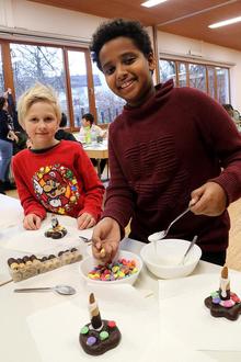 Mattis (links) und Kirubel (rechts) hatten Spaß am Kreieren der Lebkuchenkerzen.