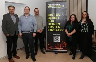 (vl.) Bürgermeister Manfred Ockel, Stadtbrandinspektor Christian Rolle, stellvertretender Stadtbrandinspektor Sven Schmitt sowie die Projektleiterinnen Tamara Theobald und Stephanie Hildebrandt.