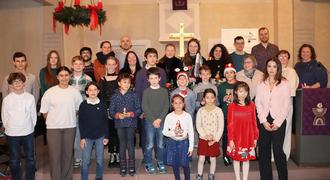 Zur musikalischen Eröffnung sangen Ingrid Früchtel und Kerstin Wassermann das Duett „Pie Jesu“ aus der Feder von Andrew Lloyd Webber. Anschließend wurde Wassermann von Dozentin Daniela Sarra auf der Querflöte zu „Laudate Dominum“ von Wolfgang Amadeus Mozart begleitet. Starkes Kontrastprogramm, das gleichzeitig auch deutlich machte, wie vielseitig das Angebot der Musikschule Kelsterbach ist, präsentierten die Brüder Philipp und Oskar Fetouaki am Klavier mit „The old Banjo“ und dem Weihnachtsklassiker „Jingle Bells“. Eindeutig in die Kategorie „heiter“ fiel das beliebte Kinderlied „Meine Oma fährt im Hühnerstall Motorrad“, das Josefine Herbert am Violoncello spielte. Dem lies das Mädchen noch den Weihnachtssong „Morgen kommt der Weihnachtsmann“ folgen. Anschließend nahm Emil Hansen am Klavier Platz, um dem Publikum mit einer Darbietung des Präludium in G-Dur von Alexander Skrjabin sein musikalisches Können zu zeigen. Gesangsschüler Benedikt März rundete mit „The Town of Bethlehem“ diesen ersten Block harmonisch ab.