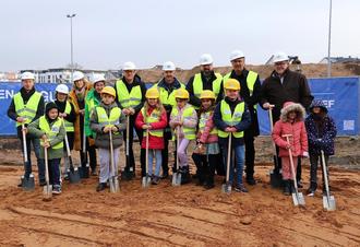 (hinten vlnr): Dirk Westpfahl (Architekt Phase 10), Isabella Brauns (ehemalige Schulleiterin KTS), Sybille Schlemmer (stellvertretende Schulleiterin KTS), Brigitta Hedde (Leiterin Staatliches Schulamt), Christian Lanzinger (Kplan), Peter Hartmann (Hochtief), Frank Wiegand (Stadtverordnetenvorsteher), Bürgermeister Manfred Ockel und Otmar Püchert (Hochtief) mit Kindern der KTS beim Spatenstich für den Schulneubau.