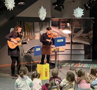Am vergangenen Freitag veranstaltete die Musikschule ein zauberhaftes Weihnachtskonzert in der Stadt- und Schulbibliothek. Zu Gast war das Duo Elvenhain. Bereits im letzten Jahr konnte das Duo die Besucherinnen und Besucher bei einem herbstlichen Konzert begeistern. Diesmal hatten Katharina Grossardt (Gitarre und Gesang) und Katrin Brecht (Violine) weihnachtliche Musik im Gepäck. Die Kinder und ihre Familien waren dazu eingeladen, aktiv beim Konzert mitzumachen. Mit Rasseln, Tüchern und Fingerzimbeln - kleinen Fingerschellen - unterstützte das junge Publikum die Stücke des Duos. Bei den bekannten Weihnachtsliedern „In der Weihnachtsbäckerei“, „Schneeflöckchen, Weißröckchen“ und „Kling Glöckchen klingelingeling“ durften alle Anwesenden mitsingen. Nach rund 50 Minuten war das Weihnachtskonzert beendet und alle in bester Vor-Weihnachtsstimmung. (fis)
