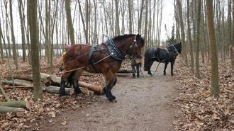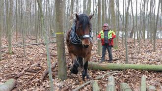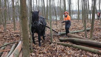 Beate (im Vordergrund) und Hektor ziehen die Baumstämme aus dem Wald am Mönchwaldsee zu Stapeln.