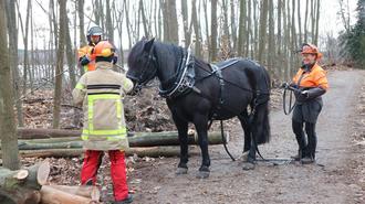 Volker Schmelz ist mit seiner Lebensgefährtin Irene Noll und den beiden Pferden Hektor, einem Noriker-Haflinger-Mix, und Beate, einer Belgischen Stute, aus Linden bei Gießen gekommen. Was die Feuerwehr an Bäumen bereits aus dem Waldbestand entnommen hat, ziehen die Pferde mit Hilfe von Eisenketten und unter den Kommandos von Schmelz und Noll durch die Bäume bis zum Wegesrand. Dabei ziehen die Pferde jeden Stamm so, dass sie am Ende gestapelt sind – auch das will gelernt sein – und vom Stapel werden die Stämme später wiederum maschinell vom KKB abtransportiert.