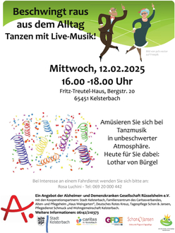 Der beliebte Tanznachmittag für Seniorinnen und Senioren findet wieder statt. Wie immer mit dabei gute Musik. Neue Teilnehmerinnen und Teilnehmer sind herzlich willkommen!
