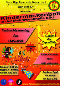 Auch dieses Jahr möchten wir mit euch den Kindermaskenball feiern. Dieser findet nun von 13:00 - 17:00 Uhr statt, dafür jedoch lediglich am Sonntag, den 15.02.2026 (Saalöffnung 12:00 Uhr).