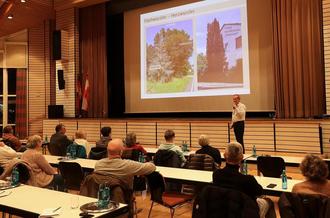 Nun war Wolf an der Reihe, der in etwas mehr als einer Stunde das anwesende Publikum mit vielen interessanten Informationen versorgte, die gerade zu Beginn ein wenig hoffnungsvolles Bild von den jetzt schon spür- und sichtbaren Folgen des Klimawandels zeichneten. Zunehmende Hitze und Dürre seien für Bäume und Pflanzen erhebliche Stressfaktoren, Schäden durch daraus resultierende Austrocknung oder Sonnenbrand führten oftmals zum Absterben der Bäume und Sträucher. Doch der Experte verkündete nicht nur Hiobsbotschaften, sondern lieferte auch zahlreiche Beispiele, welche Bäume und Hecken Hitze und Dürre gut aushalten und als Alternative zu heimischen Gewächsen genutzt werden könnten. Dazu gehören beispielsweise der Amberbaum „Liquidambar Styracifula“, bei dem keine Gefahr von Rindenbrand bei großer Hitze besteht, der „Sieben-Söhne-des-Himmels“-Baum oder der persische Eisenholzbaum „Parrotina Persica“. Eine speziell auf Kelsterbach zugeschnittene Empfehlungsliste ist auf der Homepage der Klimainsel zu finden unter www.klimainsel-kelsterbach.de im Unterpunkt „Kelsterbach fördert Grün“.