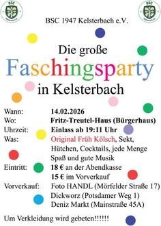 Der BSC 1947 Kelsterbach lädt am Samstag, den 14.02.2026 zur Faschingsparty im Bürgerhaus Kelsterbach ein. Einlass ist ab 19:11 Uhr. Eintrittskarten gibt es im Vorverkauf (15 €) bei Foto Handl, im Deniz Markt und in der Gaststätte Dickworz. Um Verkleidung wird gebeten! Mit dreifachem "Helau" freut sich der BSC auf Euren Besuch.