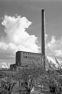 Das Kesselhaus der Glanzstoff-Fabrik mit Schornstein im Jahr 1953.
