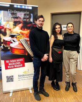 Sienna Marlene Urso (m) mit ihrer Gesangslehrerin Krista Ndoja (r) und Klavierdozent Lorenz Werling.