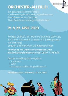 An der Musikschule Kelsterbach findet am Freitag, 21. April, und Samstag, 22. April, ein generationsübergreifendes Orchesterprojekt statt. Bei diesem Projekt sollen verschiedene Generationen (Kinder, Jugendliche und Erwachsene) miteinander gemeinsam Musik machen. Egal ob Schülerin oder Schüler, Eltern, Großvater und Enkelin, Tante und Neffe oder einfach Personen, die Lust haben, Musik in einer Gruppe zu machen - alle können sich zu diesem Projekt anmelden. Voraussetzung ist, dass man ein eigenes Instrument und musikalische Grundkenntnisse hat. Verschiedene einfache Arrangements werden an den zwei Tagen geprobt. Am Samstagabend gibt es eine kleine Abschlusspräsentation, zu der Freunde und Familienangehörige eingeladen werden können.