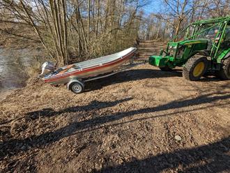 Die beiden Forstwirte Michelle Bechtel und Robin Staack, die dem Kelsterbacher Kommunalbetrieb (KKB) angehören, kümmerten sich vor Ort um den Transport auf die Vogelinsel und bauten das Gerüst für den Nistkasten dort auf. Für den Transport hat sich der KKB das Boot der Freiwilligen Feuerwehr ausgeliehen. Der Staudenweiher führt aktuell wenig Wasser und man hofft allerorts auf ausgiebigen Regen. Das Niedrigwasser und das sandige, steile Ufer machten es notwendig, das Boot mit einem Traktor zu Wasser zu lassen.