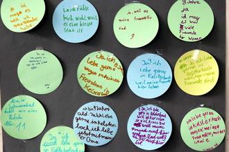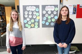 Charlotte (links) und Mina (rechts) moderierten die Konferenz und trugen die Beiträge der Teilnehmer auf einer Stellwand zusammen.