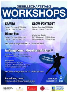 Die SKV Nauheim lädt alle Mitglieder und Interessierten herzlich ein, sich zu den Workshops oder zum Anfängerkurs anzumelden, die jeweils in der SKV-Halle in der Königstädter Str. 75 in Nauheim stattfinden werden. Dies ist eine großartige Gelegenheit, das Tanzbein zu schwingen, nette Leute kennenzulernen und die positive Energie des Tanzens zu erleben.