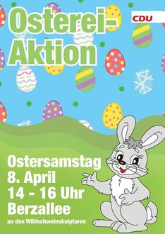 Die CDU Nauheim lädt Jung und Alt zu unserer Ostereiaktion ein. Am Ostersamstag, 08.04.2023, von 14.00 Uhr bis 16.00 Uhr bieten wir Kaffee, Kuchen uns Spiele in der Berzallee bei den Wildschweinskulpturen an. Wir freuen uns auf Ihr Kommen!