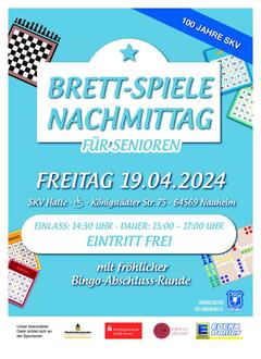 Zum Brettspielnachmittag für Senioren lädt die SKV Nauheim am 19.04.2024 von 15.00 bis 17.00 Uhr (Einlass: 14.30 Uhr) in die barrierefreie SKV-Halle, Königstädter Str. 75, 64569 Nauheim, ein. Der Eintritt ist frei.