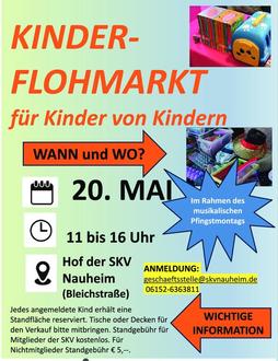 Anmeldungen für einen Flohmarktstand (Vereinsmitglied kostenlos, Nichtmitglied € 5,00) nimmt die Geschäftsstelle der SKV Nauheim e. V. (06152-6383611 oder geschaeftsstelle@skvnauheim.de) entgegen. Weiter Infos unter www.skvnauheim.de