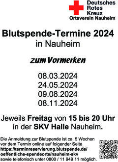 Die nächste Blutspende in Nauheim findet am Freitag, den 8. März 2024 von 15:00 bis 20:00 Uhr in der Nauheimer SKV-Halle statt.