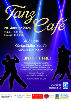 Am Sonntag, 28. Januar 2024, veranstaltet die SKV Nauheim von 15.00 bis 18.00 Uhr (Einlass ab 14.30 Uhr) ihr erstes Tanzcafé. Eine gute Gelegenheit für alle Tanzbegeisterten in geselliger Atmosphäre das Tanzbein zu schwingen. Tanzen baut Stress ab, hält fit & gesund, beflügelt und schenkt Spaß und Lebensfreunde. Neben Standard- und Lateintänzen gibt es noch mehr im Angebot. Es wird ein buntes Musikprogramm aus verschiedenen Genres geben. Zur Stärkung werden heiße und kalte Getränke sowie eine Kuchentheke angeboten. Der Eintritt ist frei! Veranstaltungsort ist die SKV-Halle, Königstädter Str. 75, 64569 Nauheim. Eine Anmeldung ist nicht erforderlich. Bei Fragen können sich Interessierte per Mail an tanzcafe@skvnauheim.de wenden. Die SKV Nauheim freut sich auf Sie!