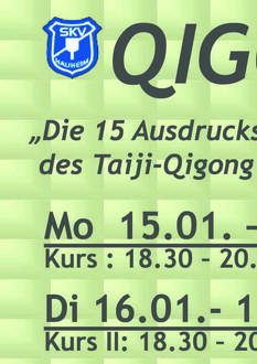 Im Kurs werden Elemente aus der Methode „Die 15 Ausdrucksformen des Taiji-Qigong" nach Prof. Jiao Guorui geübt. Dazu gehören Übungen in äußerer Ruhe und in Bewegung. Vorkenntnisse sind nicht erforderlich. Wer ein Interesse an aktiver Entspannung sowie am Erspüren des eigenen Körpers in Ruhe und Bewegung und in ihrem Wechselspiel hat, bringt gute Voraussetzungen für das Üben mit. Benötigt werden lockere Kleidung und (rutschsichere) Socken oder Schuhe mit dünner Sohle. Auch barfuß kann geübt werden. Weitere Informationen unter www.skvnauheim.de