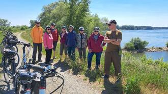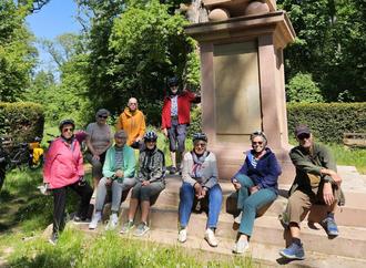 Unter strahlend blauem Himmel trafen sich neun OGV-Mitglieder und Gäste, darunter sechs Frauen, um 10:00 Uhr zum traditionellen Mai-Radausflug des OGV Nauheim. Nach einer kurzen Begrüßung und Sicherheitseinweisung startete die Fahrt vom Nauheimer Bahnhof aus Richtung Trebur durch die herrlich grüne Riedlandschaft zum Rhein. Auf dem Rhein-Hauptdamm ging es Richtung Kühkopf-Knoblochsaue. Der Name Knobloch leitet sich von der Familie Knobloch ab, die um das Jahr 1500 in diesem Gebiet ansässig war. Nach ca. 90 Minuten und ca. 23 km erreichte die Gruppe das Ziel, die Schwedensäule. Eine Informationstafel illustrierte die Rheinüberquerung vom Heer des Schwedenkönig Gustaf-Adolf im Rahmen des Dreißigjährigen Krieges (17. Dez. 1631).