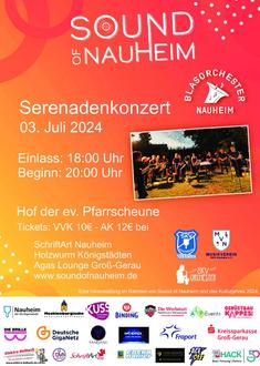 Freuen Sie sich auf das Serenadenkonzert des Blasorchesters Nauheim am 03.07.2024 (Einlass 18.00 Uhr; Beginn 20.00 Uhr) im Pfarrgarten der evangelischen Pfarrscheune (Pfarrgasse 13, 64569 Nauheim).